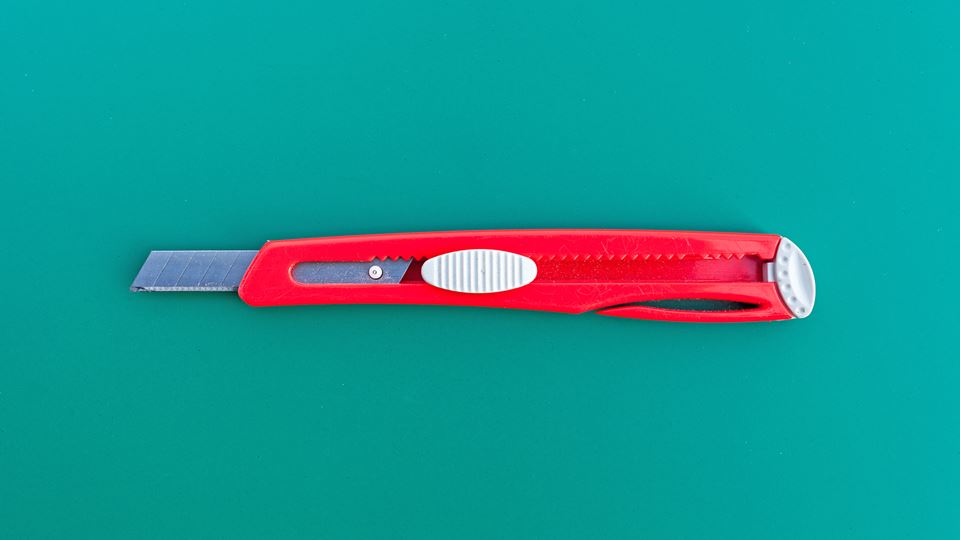 6 - «X-acto» em vez de um objeto idêntico a uma caneta, mas que, num dos extremos, possui, no lugar do bico, uma pequena lâmina que se recolhe e que serve para cortar cartões, cartolinas, fita-cola grossa e papelão.