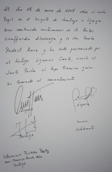 Ao responderem que sim, o Papa disse que oficializaria o seu casamento ali mesmo. Foi assim que, em pleno voo, com o piloto como padrinho e os votos registados numa folha de papel A4, o Papa Francisco realizou esta quinta-feira o primeiro casamento "papal" a bordo de um avião.