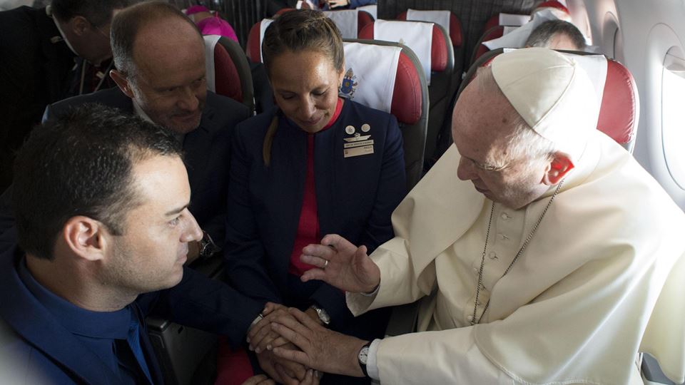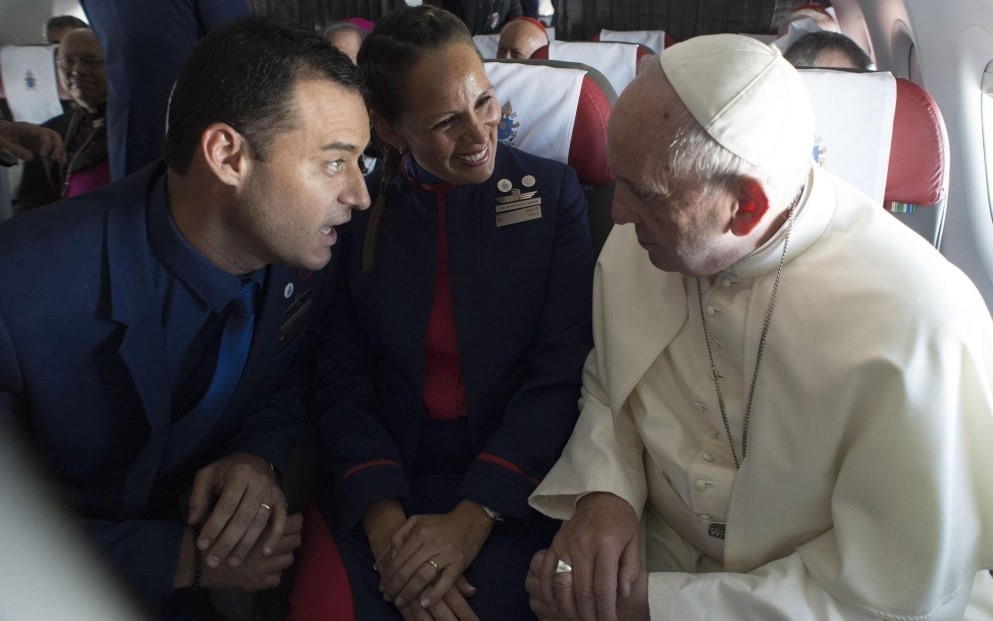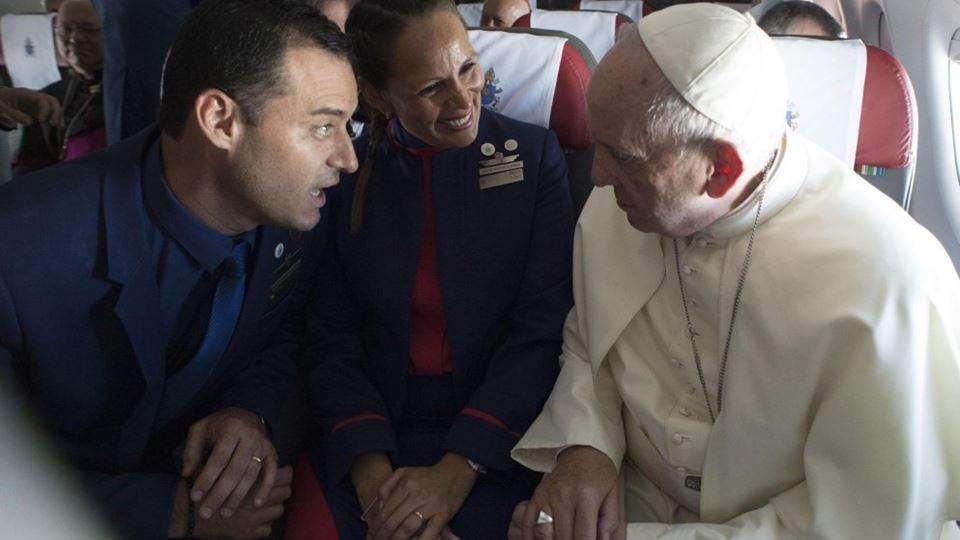 Na sua visita ao Chile, no avião a caminho de Iquique, no norte do país, o Papa Francisco foi abordado por dois assistentes de bordo.
