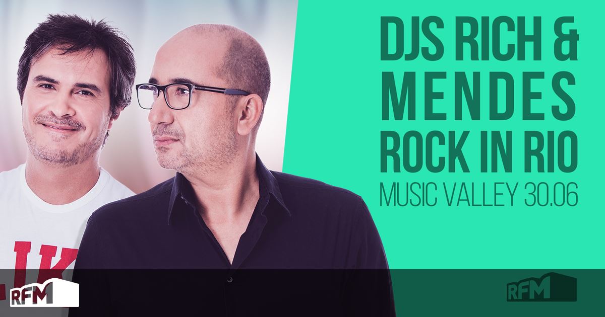 Já é conhecido o último nome do cartaz do Music Valley - o palco non stop da Cidade do Rock que vai oferecer 14 horas de música por dia. Para além das festas Somersby Pool Parties e de grandes nomes da música actual, vais poder contar com Diego Miranda, Vintage Club e anunciados pela Roberta Medina no programa BFF da RFM... os DJs Rich & Mendes.